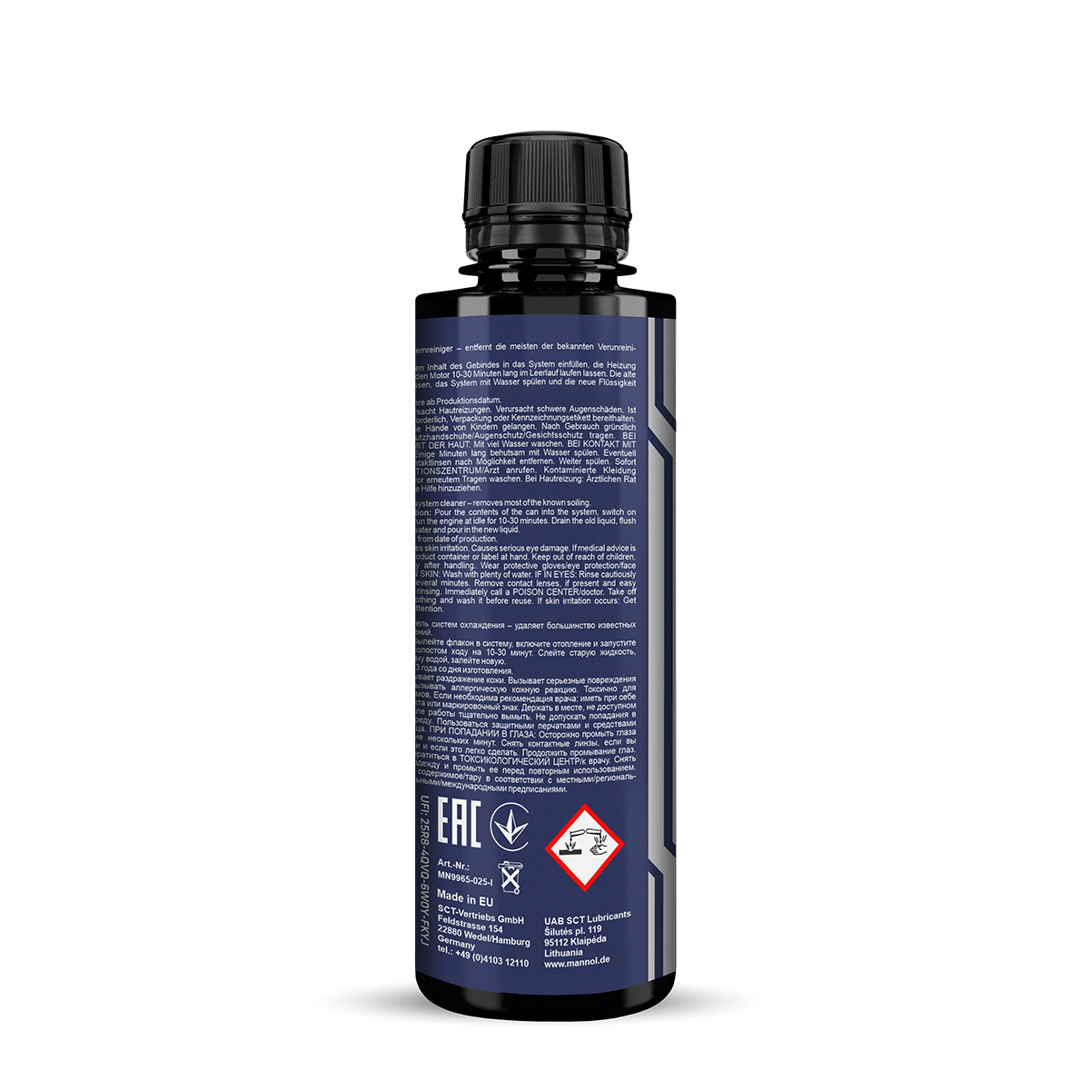 Application: Add the contents of the bottle to the cooling system, turn on the heater and start the engine at idle speed. Allow the engine to warm up to operating temperature and run for 10 to 30 minutes, depending on the expected degree of contamination. Drain the old coolant and flush the system with water, then refill the cooling system with new coolant.