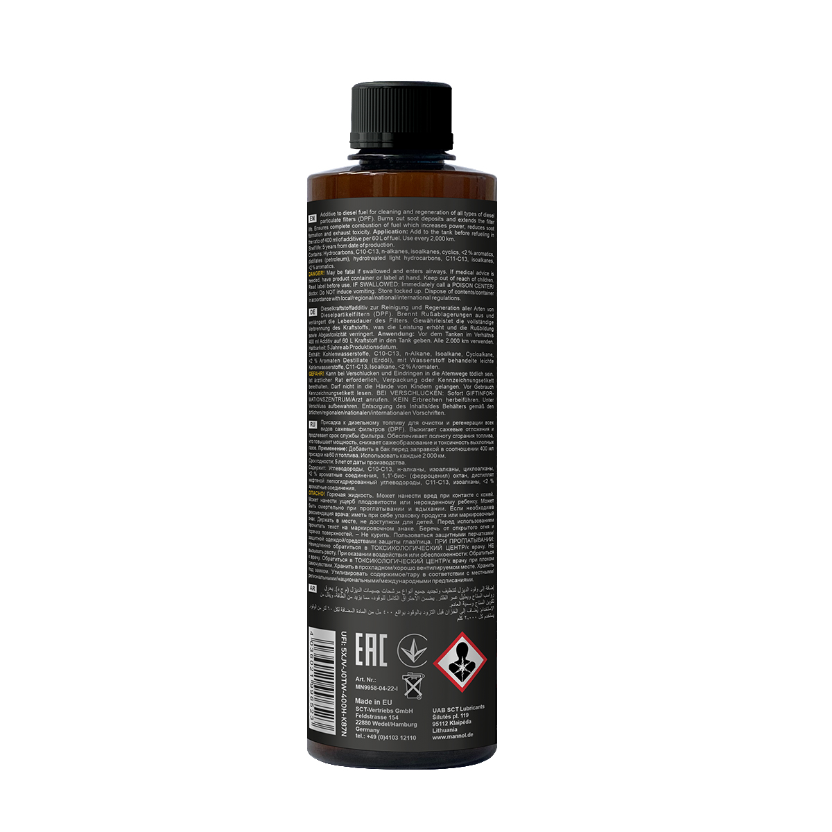Diesel fuel additive for cleaning and regeneration of all types of Diesel Particulate Filters (DPF) without dismantling and disassembling. Suitable for all types of diesel fuel and for all types of diesel engines equipped and not equipped with automatic DPF regeneration systems. Especially recommended for cars operating in the city (in traffic jams) and / or when using low quality fuel.
