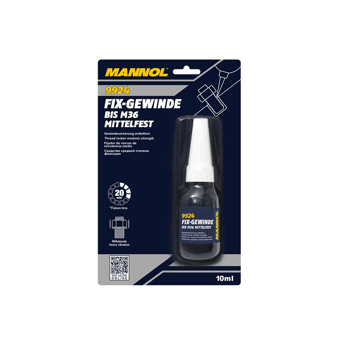 Fix-Gewinde Mittelfest 9924/9925-tool for fixing all types of threads (medium fixation): bolts, nuts, studs, screws, etc. Prevents self-unscrewing of fasteners due to increased loads and vibration. Suitable for all threaded connections in all parts of cars, motorcycles, commercial vehicles, as well as in industry and in everyday life. It can be used for sealing threads and narrow gaps, as well as as an anti-corrosion agent.